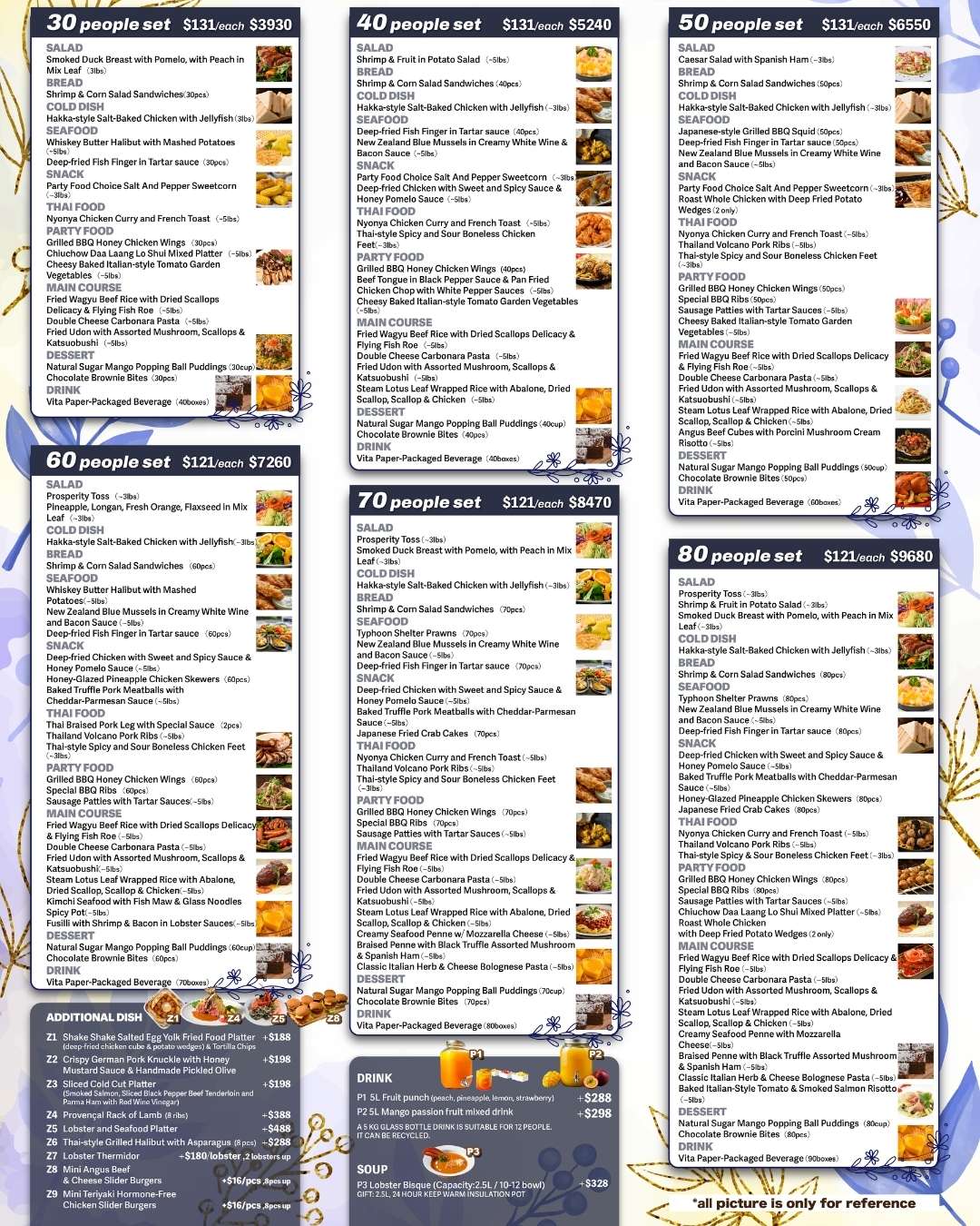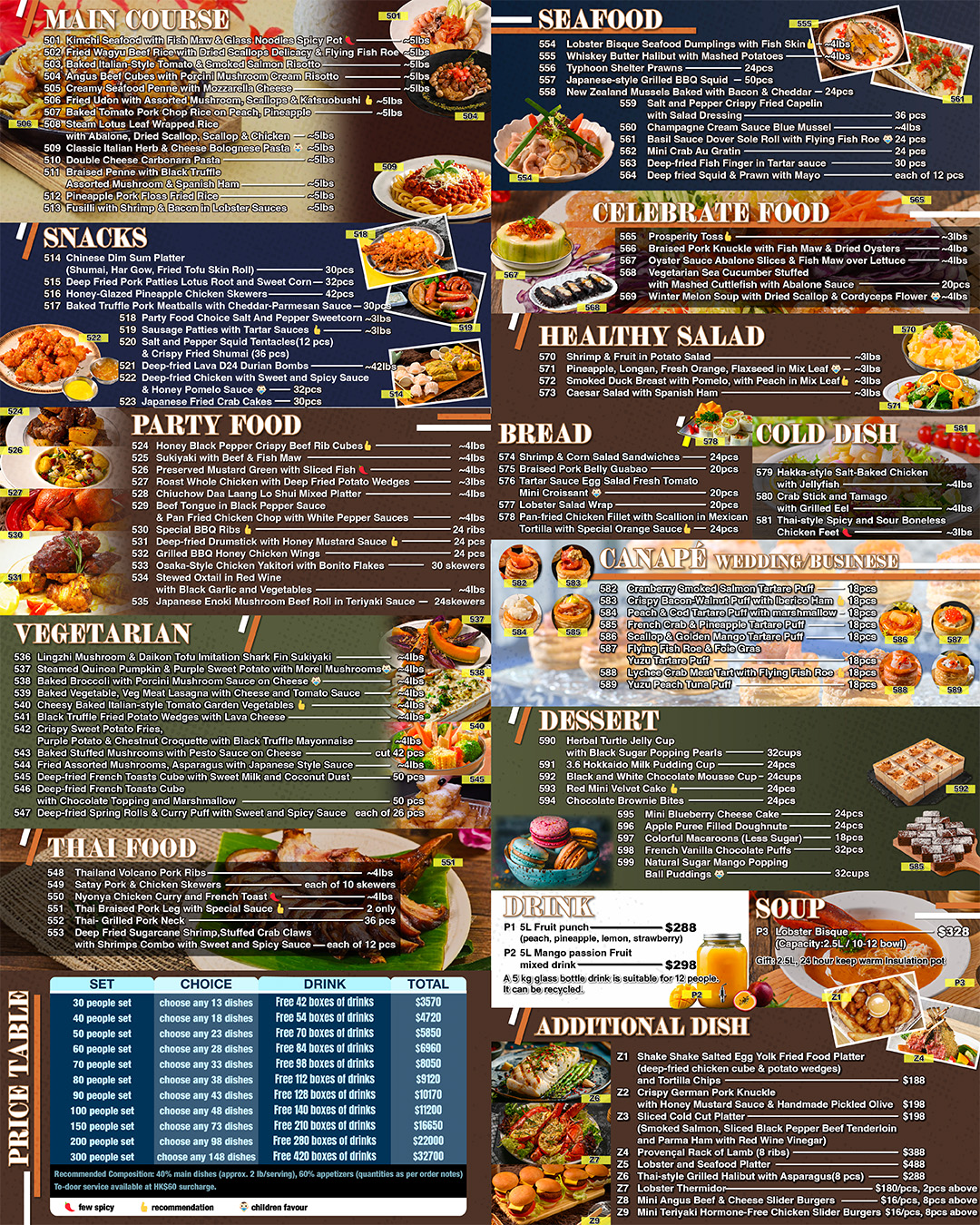 Cuisine Types: Chinese, Western, Japanese, Korean, Thai ,Drinks: Packaged drinks ,Number of Guests: 30-300 ,Event Type: Large, medium, or small-scale catering ,Venue: Indoor & outdoor